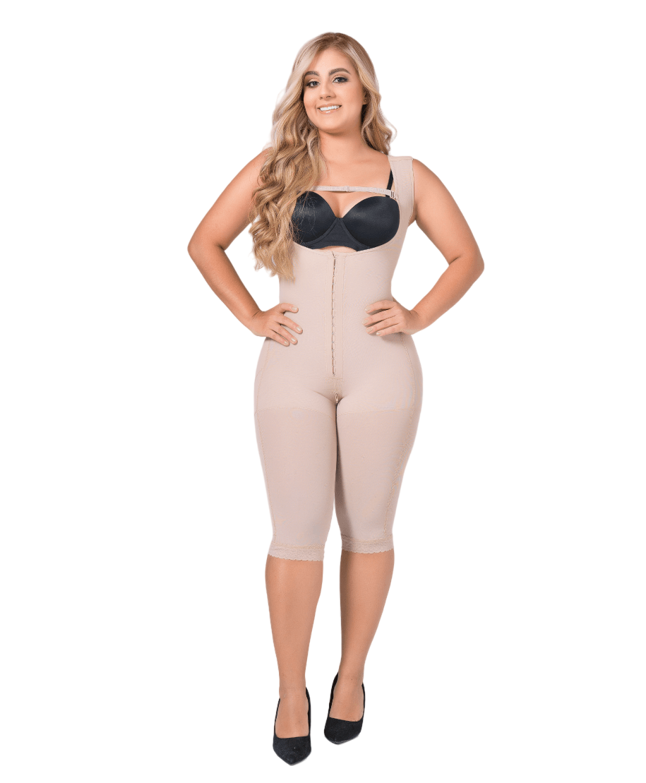 Características: Faja moldeadora de alta compresión, tipo sisa o camisilla con total cubrimiento axilar y de espalda, broche ajustable en hombros, 2 niveles de broche al centro, realce de glúteos, a la rodilla.